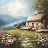 Een schilderachtige idylle ontvouwt zich waar een charmante rieten hut troont tussen bloeiende weiden. Kleurrijke bloemen omzomen het grindpad en nodigen je uit om te blijven hangen. Zachte heuvels en mystieke mist omhullen het landschap, terwijl een sfeer van vrede en afzondering de ziel omarmt. Een plek waar de tijd lijkt stil te staan.