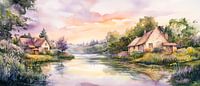 Zachte kleuren en idyllische landschappen komen samen in deze harmonieuze compositie. De pittoreske huisjes worden weerspiegeld in het kalme water, omringd door bloeiende natuur en een delicate lucht. Dit kunstwerk is ideaal voor de woonkamer, straalt een ontspannen sfeer uit en nodigt uit om te dromen.
