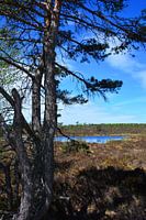 Boom in een landschap met een meer en een blauwe lucht, in de zwarte heide in de Rhön, Beieren, Duitsland.