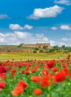 Idyllische landschapsmening van rode klaproosveldbloemen, blauwe bewolkte hemel en oud mediterraan huis