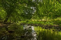 Dit mooi idyllische plekje aan de rand van een watertje, fotografeerde ik in de Eifel in Duitsland. Het licht werd gefilterd door het bladerdak van verschillende bomen en door de reflectie van de frisse groene bladeren in het beekje wordt het groen nog eens extra versterkt. Aan de kant staan planten met grote groene bladeren waarin de nerven goed zichtbaar zijn.