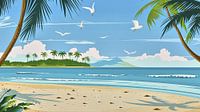 Deze idyllische illustratie toont een rustig tropisch strand met hoge palmbomen en vliegende vogels. Het zachte zand strekt zich uit langs de kust, terwijl de majestueuze palmbomen zachtjes wiegen in de wind en schaduw bieden. De helderblauwe lucht is versierd met een paar verspreide wolken, terwijl vogels erboven vliegen in harmonieuze…