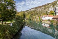 Idyllisch uitzicht op het dorp Markt Essing in het Altmühltal met hoge rotsen aan de rand van het dorp en weerspiegeling van het dorpssilhouet in het water op een zonnige dag in de herfst