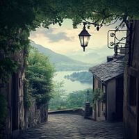 Tussen glooiende heuvels en een glinsterend meer ontvouwt zich een betoverend steegje met historische huizen. Een oude lantaarn werpt een zwak licht op de geplaveide straat, terwijl tere planten de geplaveide stenen omarmen en het uitzicht in de verte leidt naar een schilderachtig landschap. Hier smelten natuur en nostalgie samen tot een betoverend panorama.