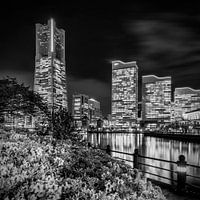 Over ‘Idyllische skyline van Yokohama bij nacht | monochroom’ van Melanie Viola