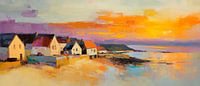 Een zachte zonsondergang kleurt de lucht in levendige oranje en roze tinten, terwijl charmante kusthuisjes vredig aan de kust staan. Het reflecterende wateroppervlak vangt het licht en versterkt de rustige sfeer. Dit schilderij is ideaal voor de woonkamer, brengt een ontspannen maritieme sfeer en nodigt uit om te dromen.