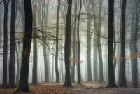 Dit is een van die taferelen die ik fotografeerde in een bekend bos op de Veluwe en die er in dichte mist zo anders uitzien dat je het nooit meer terugvindt als je er in andere weersomstandigheden naar zoekt. Zo zag dit tafereel er alleen uit in de dichte mist van een vroege winterochtend. Kleine herfstblaadjes hangen nog aan de onderste takken en de bomen veranderen in mysterieus aandoende silhouetten.