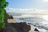 Dit is eigenlijk iemand's achtertuin aan de North Shore op het eiland O'ahu, Hawai'i, VS. Alle stranden zijn openbaar en dus moeten de luxueuze huizen aan de kust toegang bieden tot die stranden. Het moet fantastisch zijn om hier te wonen en de hele tijd dit uitzicht te hebben.
