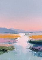 Dit abstracte olieverfschilderij toont een Iers landschap tijdens het gouden uur. Een lange rivier kronkelt door gele en groene velden, met bergen in de verte op de achtergrond. De lucht straalt in zachte roze en blauwe tinten, terwijl zichtbare penseelstreken textuur en diepte toevoegen aan de minimalistische compositie. Het harmonieuze kleurenschema en de heldere vormen creëren een kalme, vredige sfeer. Het werk combineert abstracte esthetiek met naturalistische landschapselementen, waardoor een elegante weergave van de Ierse natuur ontstaat die zowel lichtheid als uitgestrektheid uitstraalt.