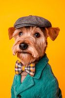 Met een charmante, ondeugende blik en een elegante outfit straalt deze Ierse Terrier persoonlijkheid uit. Zijn zachte, roodachtige vacht harmonieert perfect met de stijlvolle pet en nette strik, terwijl de felgele achtergrond zijn vrolijke uitstraling benadrukt. Een canine dandy klaar om de wereld in stijl te veroveren!