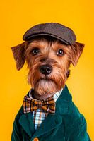 Met zijn charmante, knapperige gezicht en opvallende, zeldzame voorkomen brengt deze Ierse Terrier stijlvolle elegantie in elke scène. De chique pet en zorgvuldig geselecteerde vlinderdas voegen een vleugje dandyachtige flair toe, terwijl de felgele achtergrond zijn levendige persoonlijkheid benadrukt. Een echte blikvanger met een onmiskenbaar karakter!