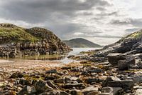 Aan de Atlantische kust, in het noorden van Ierland, vond ik dit strandje van stenen, rotsen en kliffen. Op het zand en tussen de stenen ligt aangespoeld zeewier. Het water spoelt er zachtjes over heen. Op de rotsen groeit paarse heide. De lucht is bewolkt. Het is de regen die dit eiland zo groen maakt.