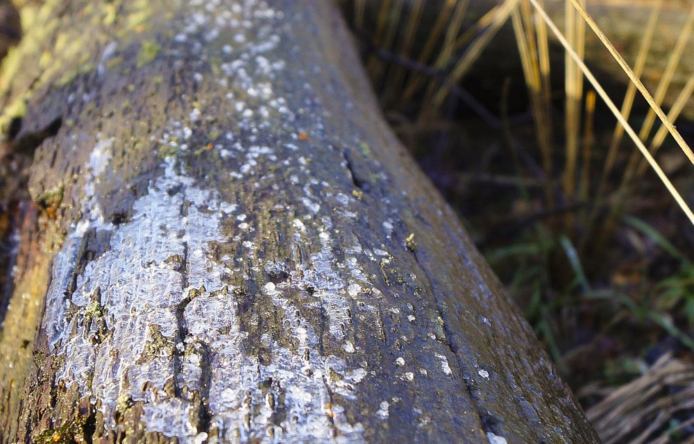 Dit is een foto van ijs op een boomstam die in de wintermaanden in het bos lag.