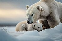 Een indrukwekkend tafereel: de majestueuze ijsbeer, met zijn dikke witte vacht en krachtige gestalte, kruipt dicht tegen zijn jong aan om het te beschermen tegen de ijzige wind en sneeuwval. De scène heeft een bijna surrealistische schoonheid. Ondanks de barre omstandigheden straalt de band tussen moeder en welp warmte en bescherming uit.