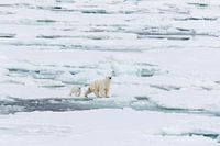 Ijsbeer met jong over het pakijs op zoek naar voedsel.