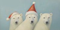 Drie elegante ijsberen met kerstmutsen aan op een ijzig blauwe achtergrond. De pastelkleuren en het lage contrast zorgen voor een serene uitstraling. Breng de gezelligheid van kerst in jouw huis met dit charmante werk!