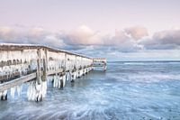 De wolken zijn licht roze gekleurd, de zee in beweging. De ijspegels aan de brugleuning zien er heel bizar uit.