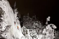 Ijsklimmen in de nacht Fins Lapland. Twee ijsklimmers klauteren tegen een loodrechte wand van ijs op een bevroren waterval. In Fins Lapland is het een van de extreme sporten die je in de winter kunt beleven. De berg wordt beschenen met grote schijnwerpers.
