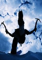 Een ijsklimmer als silhouet op het Mer de Glace, een beroemde gletsjer boven Chamonix in de Franse Alpen. Dit gebied is een mekka voor buitensporters als skiërs, wandelaars, klimmers en fietsers. De foto is artistiek.