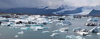 IJsschotsen breken af van de gletsjer en vallen in het ijsmeer Jokulsarlon IJsland. Langzaam smelten ze en drijven ze naar zee toe.