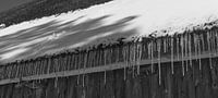 Gedeeltelijk besneeuwd rieten dak op een oude schaapskooi in het heidelandschap, met een rij ijspegels gevormd aan de rand