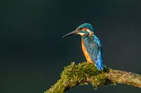 Een mannetjes Ijsvogel op een met mos begroeide tak tegen een donker groene achtergrond.