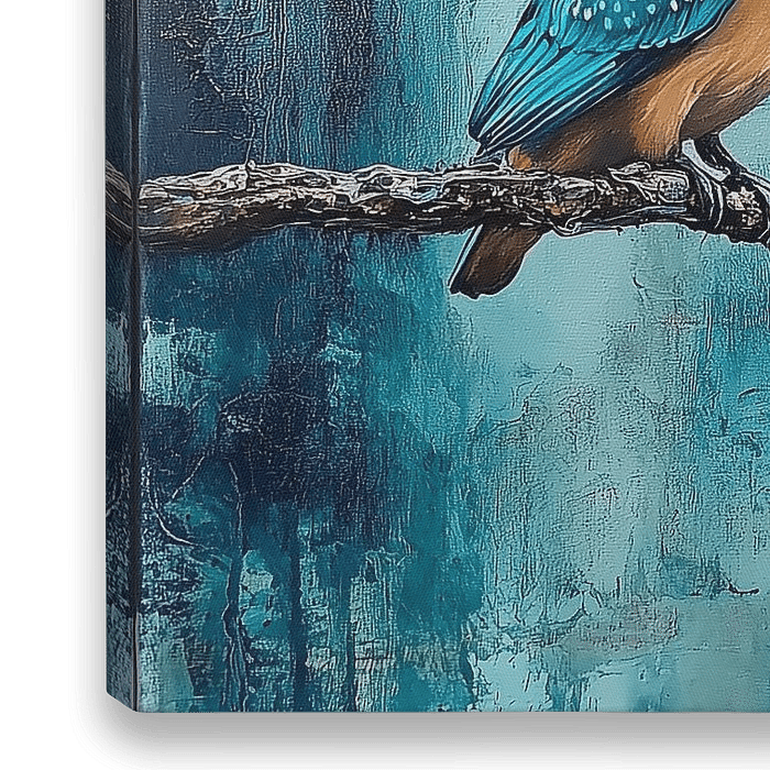 Ijsvogel op een tak tegen een blauwe achtergrond met groffe artistieke structuur. De look en feel van een schilderij met structuur, een werk dat leeft.