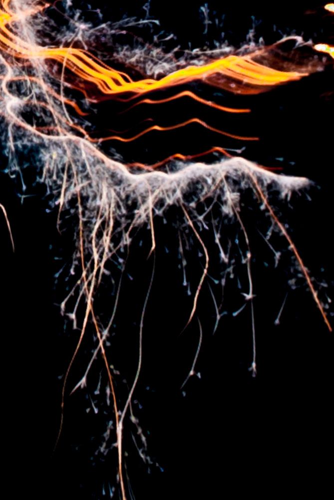 In de ijzergieterij spetteren stukjes ijzer in het rond. Ze vormen de meest facinerende figuren, die direct weer verdwijnen. Hier is zo'n moment 'bevroren'.