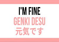 De zin "I'm fine" wordt gepresenteerd met het Japanse equivalent "Genki desu" en het Japanse schrift 元気です. Zachtroze tekst op een strakke achtergrond maakt dit een uitnodigende en ondersteunende bevestiging in Japanse conversatie.