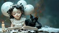 Een prachtig mooi meisje, met haar zwarte kat en haar witte ballonnen, leest een boek. Het meisje ziet er uit als een prinses in haar kanten jurkje, het heeft een retro uitstraling. Het beeld is met behulp van ai gegenereerd.