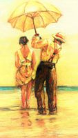 Pasteltekening/ Pastelkrijtjes / Pastelpotlood /Handgeschilderd / Inspiratie / Geïnspireerd / Jack Vettriano / Schilder /Zon / Strand / Zee / Parasol /Butler / Man / Vrouw / Figuratieve kunst / Mysterieus / Geel /