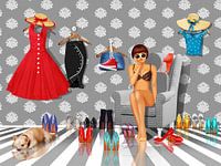 Sexy Pin-up meisje met veel hoge hakken. Zwart-wit beeld met kleurrijke accenten.