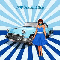 Alle in het blauw, van vintage Amerikaanse auto met de pin-up girls in retro stijl mode.