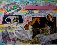 Collage met textiel, plaatjes uit een oude encyclopedie, kunstplaatje, modeplaatje, stukjes gekleurd karton, handgeschreven tekst met mijn favoriete vulpen, uitgeknipte tekst 'suiker', en het geheel afgewerkt met lijmlak. Ik houd ook echt van lezen! :-)