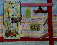 Collage met textiel, grassen uit de tuin, uitgebloeide en ingedroogde tulp, plaatjes uit natuuruitgaven, deel van een ansichtkaart, stukjes gekleurd karton, handgeschreven tekst met mijn favoriete vulpen en afgewerkt met lijmlak. Ik houd ook echt van schrijven! :-)