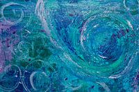 I found Heaven abstract #2 - Ik schilderde dit abstract in een speelse bui met iland ritmische muziek. Ik voelde me een beetje opgebrand, zoals dat soms gaat in het leven. Maar toen de muziek begon te spelen kwam mijn energie terug en vloog door mijn schildersgereedschap op het doek. Het voelde alsof mijn ziel zweefde. Laat het leven je niet naar beneden halen. Zet muziek op en speel, laat je gaan. Wervelende blauwe en groene tinten domineren de scène, onderbroken door streken en spatten van witte en roze tinten. Het gebruik van kleur en dynamische penseelstreken geeft een gevoel van beweging, misschien wel de turbulente schoonheid van een draaikolk of vortex.
