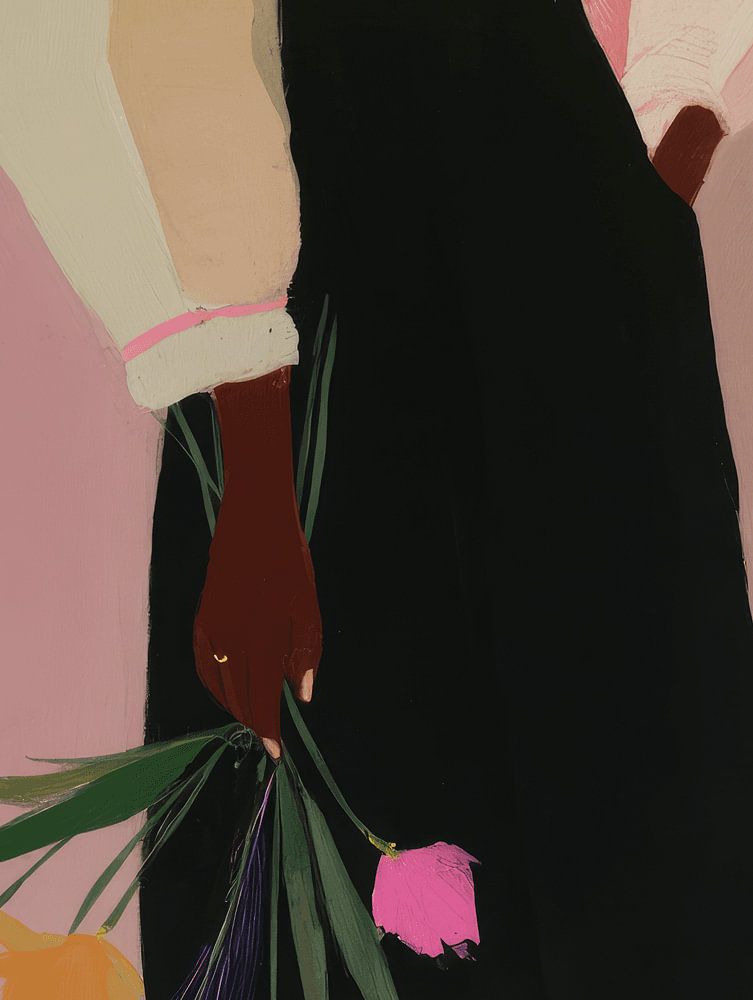 Een modern figuratief kunstwerk waarin elegantie en eenvoud samenkomen. De vrouw, slechts deels in beeld, houdt een bos kleurrijke bloemen losjes in haar hand. De zachte roze achtergrond en contrasterende donkere rok creëren een serene en stijlvolle uitstraling. Een subtiel en krachtig werk dat rust en verfijning toevoegt aan ieder interieur.
