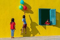 Een jongen die springt naar een paar ballonnen die vastzitten aan het dak van een huis met geel gekleurde muren. In Jakarta, Indonesie