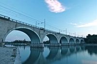 In de Italiaanse plaats Peschiera del Garda wed deze prachtige spoorbrug bij avond gefotografeerd.