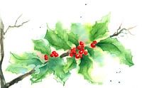 Holly twig with Red Berries is een aquarel schilderij in landschapsformaat geschilderd door de kunstenaar Karen Kaspar. Het toont een tak van een hulst met groene bladeren en felrode bessen. Het schilderij is geschilderd in een losse, frisse stijl.