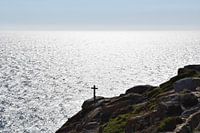 De eindeloze watervlakte van de Atlantische Oceaan strekt zich uit achter een kruis op een klif op een zonnige zomerdag. Beeld gemaakt op het Illa de Ons in Galicië, Spanje.