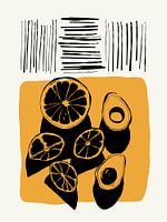 Illustratie: Sinaasappel en avocado in zwarte inkt tegen een okergele achtergrond. Speelse illustratie, leuk en origineel in de keuken!
