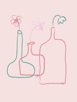 Illustratie abstract bohemian. Lijntekening van vazen met daarin veldbloemen, in verschillende roze en groentinten. Woonstijl modern en bohemian.