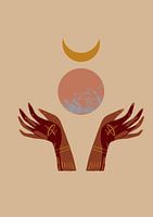 Illustratie "earth day" in aardetinten. Open handen met daarin een planeet en maan. Bohemian stijl.