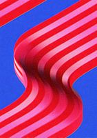Dit kunstwerk heeft een optische illusie van rode en roze strepen op een blauwe achtergrond, die de indruk wekken van golvende rondingen en diepte toevoegen. De illustratie heeft scherpe randen, felle contrasten en een moderne, grafische esthetiek. Met heldere vormen, levendige kleuren en een dynamische compositie straalt het ontwerp…