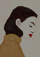 Illustratie: portret van een jongen vrouw met zwart haar en rode lippenstift in aardetinten. Woonstijl modern en bohemian.