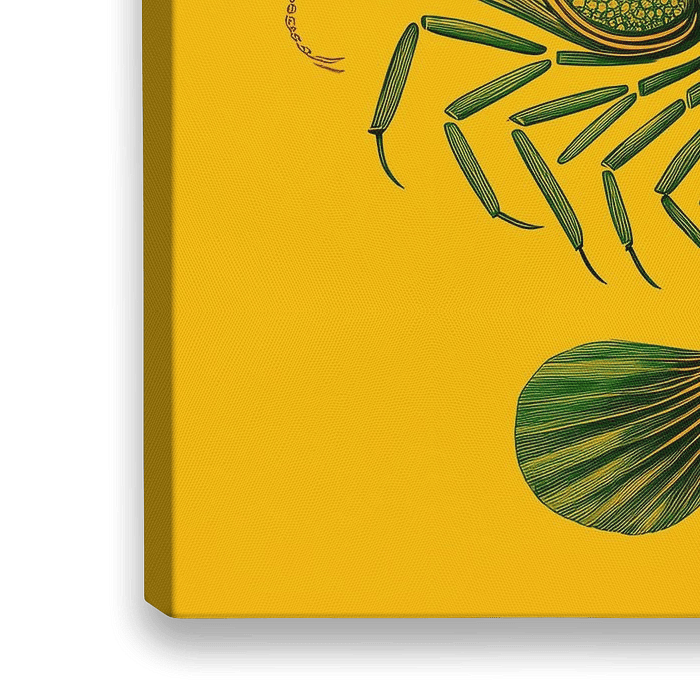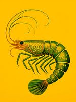 De Garnaal is uitgevoerd in groen (ton-sur-ton) met gele tinten en staat tegen een egale warm gele achtergrond.