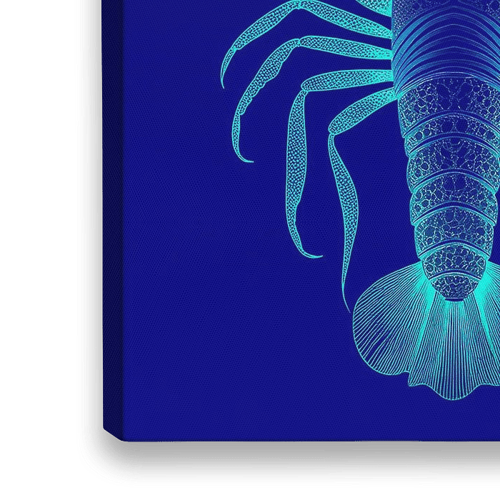 De kreeft is uitgevoerd in trendy blauwe tinten (ton-sur-ton) en staat tegen een diepblauwe achtergrond.