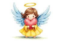 Een illustratie van een engel met cherubijnen en lichtblauwe vleugels, die een groot rood hart vasthoudt. De engel draagt een geel gewaad en heeft bruin haar, en boven zijn hoofd hangt een gouden aureool.
