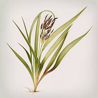 Deze delicate botanische illustratie toont een enkele grassoort met lange, slanke bladeren die sierlijk in verschillende richtingen buigen. De bladeren vertonen een spectrum van groene tinten, variërend van een delicate bleke tint tot een diepere, levendige tint, met subtiele strepen die hun textuur en structuur benadrukken. De…
